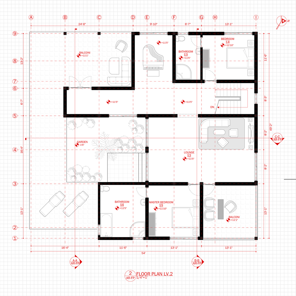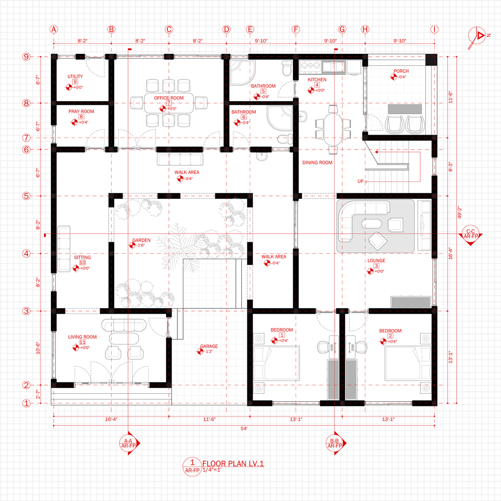Residential Modern house with office design. Complete with Floorplan, Section A-C, And Elevation East, West, North, South features.